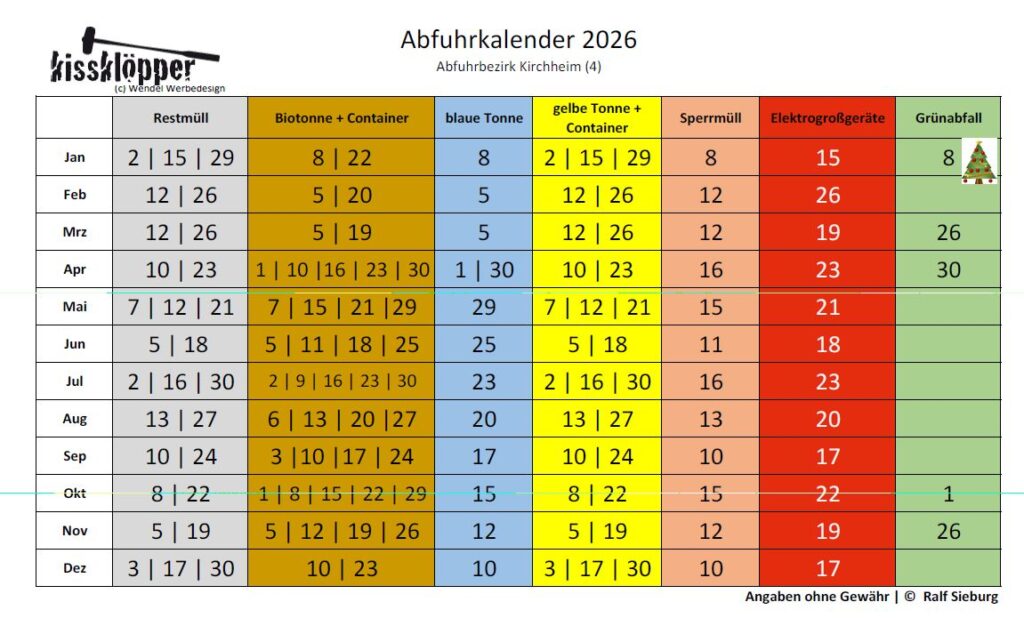 Auch dieses Jahr habe ich einen Müll-Abfuhrkalender 2026 nur für Kirchheim erstellt. Hier zum herunterladen und ausdrucken. Und da jeder jemanden kennt, der jemanden kennt der einen Drucker hat, liegt der Kalender auch nicht mehr kostenfrei im Kissklöpperlädchen aus. Kann dort aber gegen einen Selbstkostenpreis weiterhin abgeholt werden, so lange der Vorrat reicht. Den Originalkalender […]